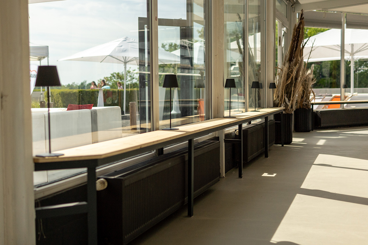 Der Schriftzug "amsee" aus Holz auf dem Tresen der Bar im Oberdeck.