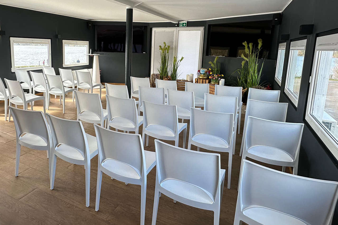 Das Oberdeck unserer Eventlocation bietet einen respektvollen Raum für Andachten, Abschiedszeremonien und Trauerreden. Die Einrichtung ist zurückhaltend in Weiß gehalten, mehrere Stuhlreihen sowie Stehtische stehen Ihnen zur Verfügung. Hier besteht auch die Möglichkeit, die Urne des oder der Verstorbenen in einem würdevollen Rahmen zu platzieren. Über zwei große Displays können Sie zudem während der Andacht schöne Erinnerungen in Form von Fotos oder Videos des geliebten Menschen teilen.